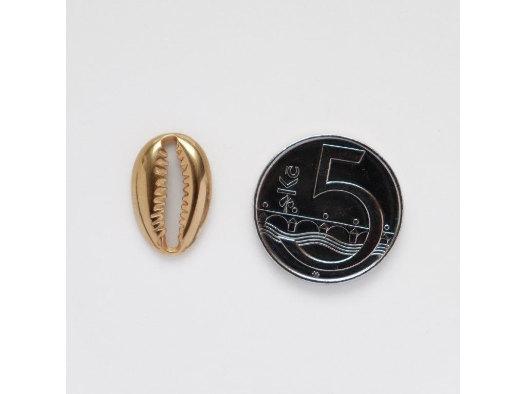 Elegantní přívěsek ve tvaru mušle (cowrie) z chirurgické oceli s pravým 18K zlatým pokovováním. Díky výraznému tvaru a hladkému lesklému povrchu působí luxusně a nadčasově – ideální pro originální šperky i letní kolekce.