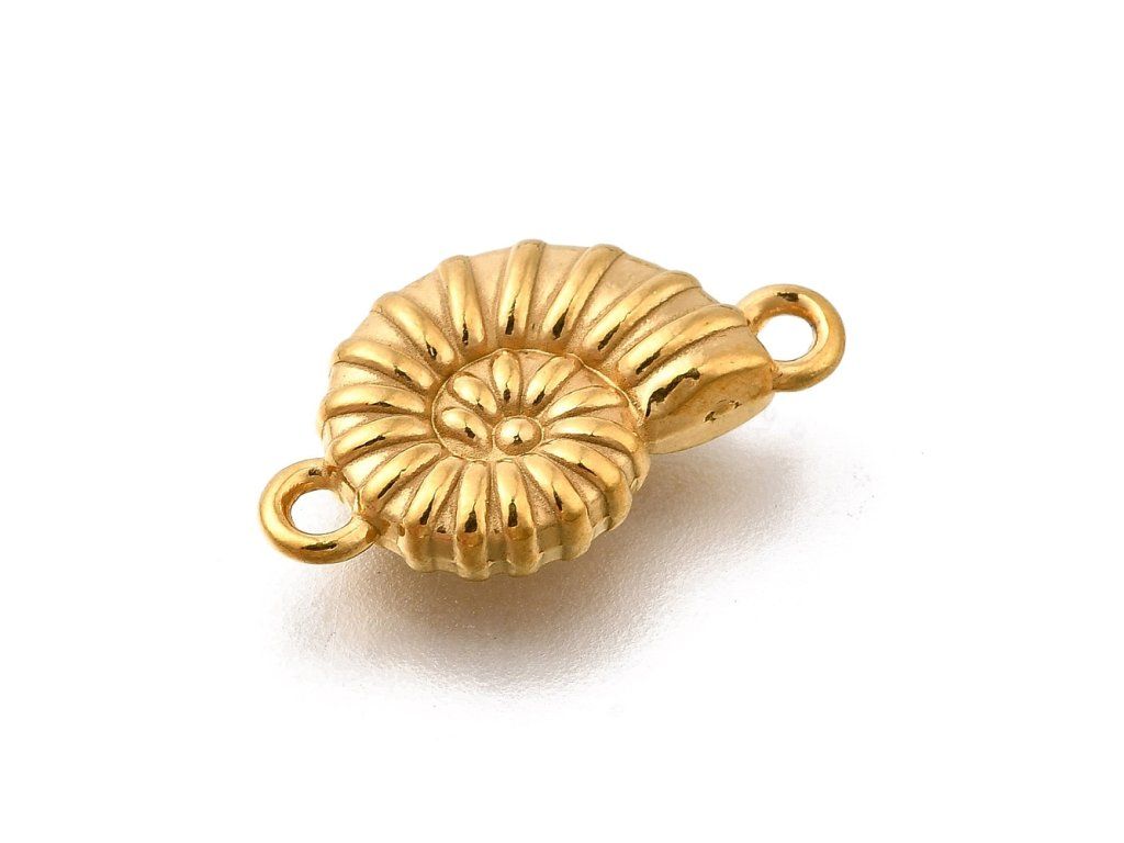 Elegantní konektor ve tvaru mušle z chirurgické oceli s pravým 18K zlatým pokovováním. Díky dvěma očkům slouží jako praktický spojovací prvek a zároveň dekorativní detail šperku.