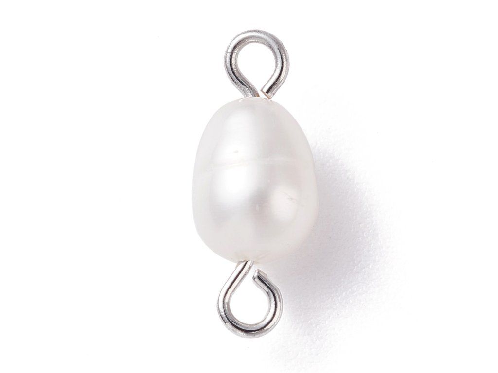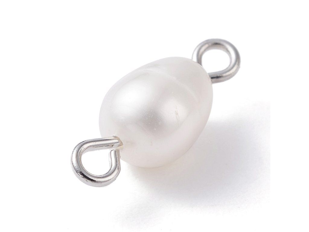 Elegantní konektor z přírodní říční perly doplněný o kovová očka z chirurgické oceli. Díky svému přirozenému tvaru a jemnému lesku působí luxusně a nadčasově – ideální pro šperky s elegantním charakterem.