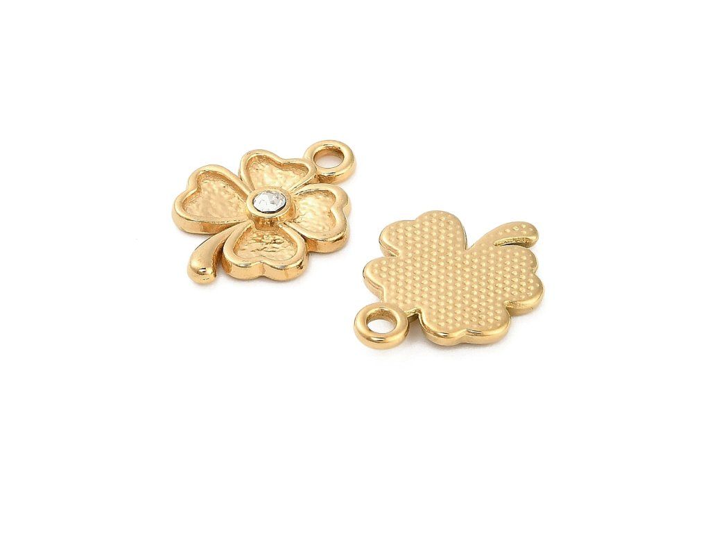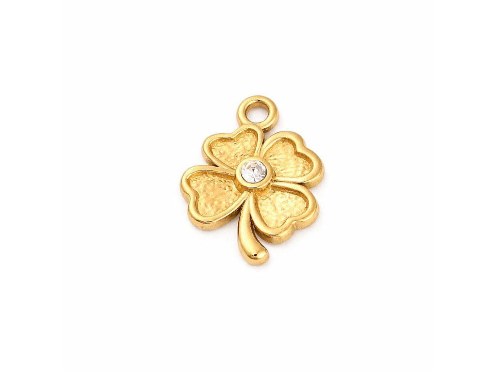 Elegantní přívěsek ve tvaru čtyřlístku z chirurgické oceli s pravým 18K zlatým pokovováním. Jemný detail doplněný o třpytivý kamínek dodává přívěsku luxusní a zároveň jemný vzhled.