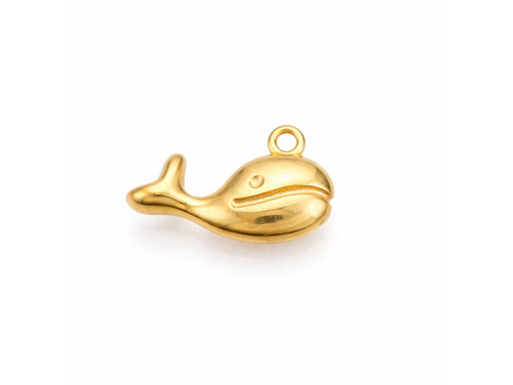 Přívěsek ve tvaru velryby z chirurgické oceli s pravým 18K zlatým pokovováním. Díky hladkému lesklému povrchu působí jemně a hravě – ideální pro šperky inspirované mořem, létem a svobodou.
